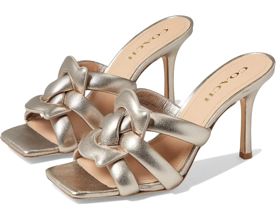Please Note: COACH™ items cannot be shipped to military addresses (APO or FPO) and addresses in Hawaii, the Virgin Islands, Guam or any other locations outside of the continental US.SKU: #9857737Exude a stylish vibe with every step you take wearing COACH® Kellie Metallic Leather Sandal.Leather upper.Leather lining and insole.Slip-on style.Knot detailing on upper.Stiletto heel.Wide squared open toe.Brand logo on insole.Leather outsole.Made in Brazil.